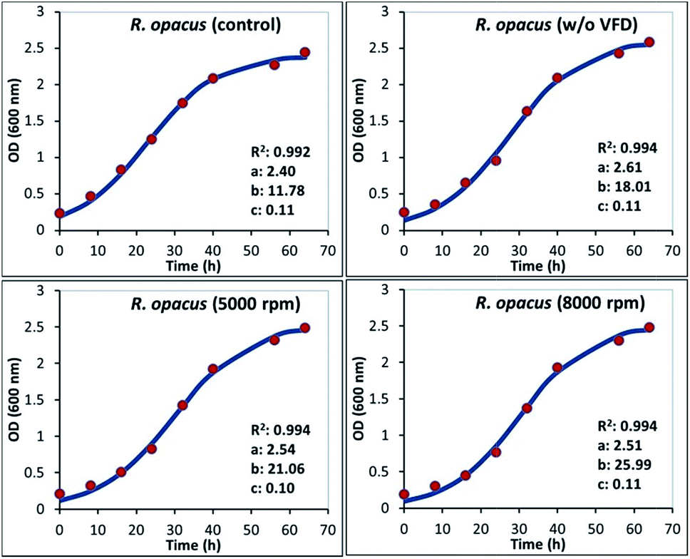 Calculation of the logistic constants (a, b, and c), curve fitting, and the statistical analysis in the form of R2 (coefficient of determination, as a parameter to show how well a statistical model fits the experimental observations) were carried out by a software program CurveExpert 1.4, and given in Fig. 7 and 8 below. In addition to the logistic model, specific growth rate of the exponential phase (μexp) were also found by calculating the slope of the linear data range of the exponential growth phase. Apparent growth rate (kc) of the overall experiment and specific growth rate of the exponential phase (μexp) are given in Table 1.