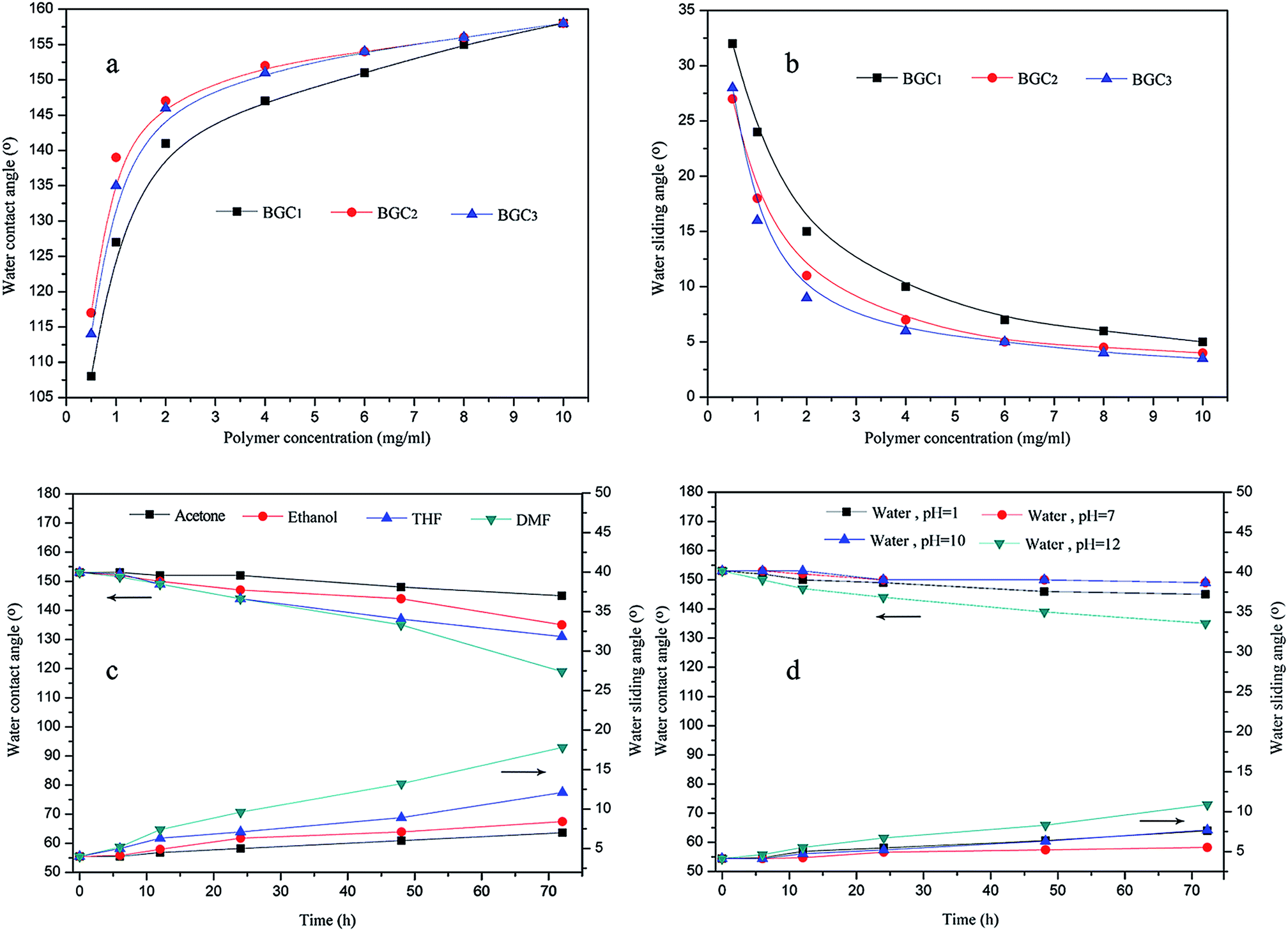 | Fig. 11 Water repellency (a and b) of cotton fabrics modified with BGC1, BGC2, and BGC3 at various concentrations, and variation of water repellency of cotton fabrics modified with BGC2 with time: immersion in various organic solvents (c), immersion in aqueous solutions at different ph values (d). | |