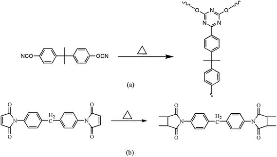 Thermosetting terpolymers composed of bis allyl benzoxazine (Bz-allyl), cyanate ester (BADCy) and 4,4′-bismaleimidodiphenyl methane (BMI) were prepared via co-curing reactions. The curing kinetics of Bz-allyl/BMI/BADCy were investigated via non-isothermal DSC at different heating rates using the Flynn–Wall–Ozawa method. The dielectric, thermal and mechanical properties of Bz-allyl/BMI/BADCy terpolymers were systemically investigated in detail through mechanical measurement, scanning electron microscopy (SEM), dynamic mechanical analysis (DMA) and thermo-gravimetric analysis (TGA). The results show that a suitable addition of Bz-allyl can enhance the impact strength and flexural strength as well as reduce the dielectric constant and the dielectric loss of BMI/BADCy. The dynamic mechanical analysis reveals that the cross-link density of the blend is higher than BMI/BADCy. The higher crosslinking density of the terpolymer led to good thermal stability of the terpolymer. Scanning electron microscopy analysis shows the distinct characteristics of ductile fracture of the blends. All of these changes in properties are closely correlated to the copolymerization between Bz-allyl and BMI/BADCy, which could form an interpenetrating polymer network in the system.