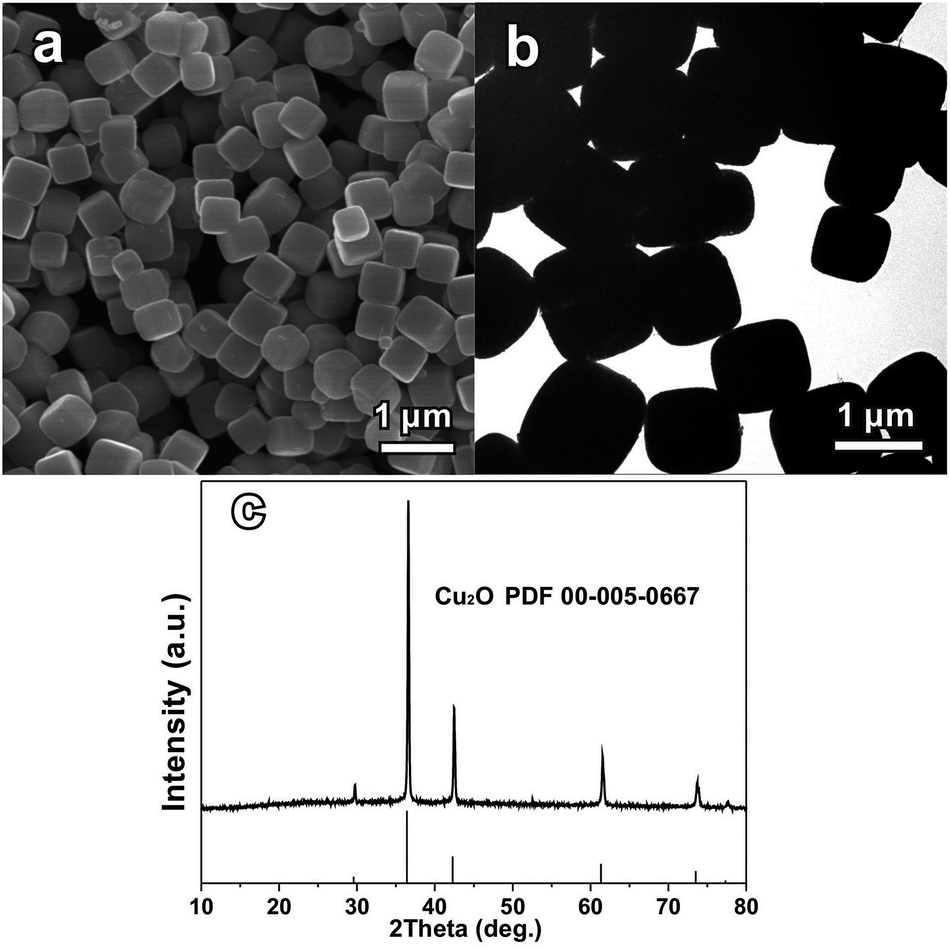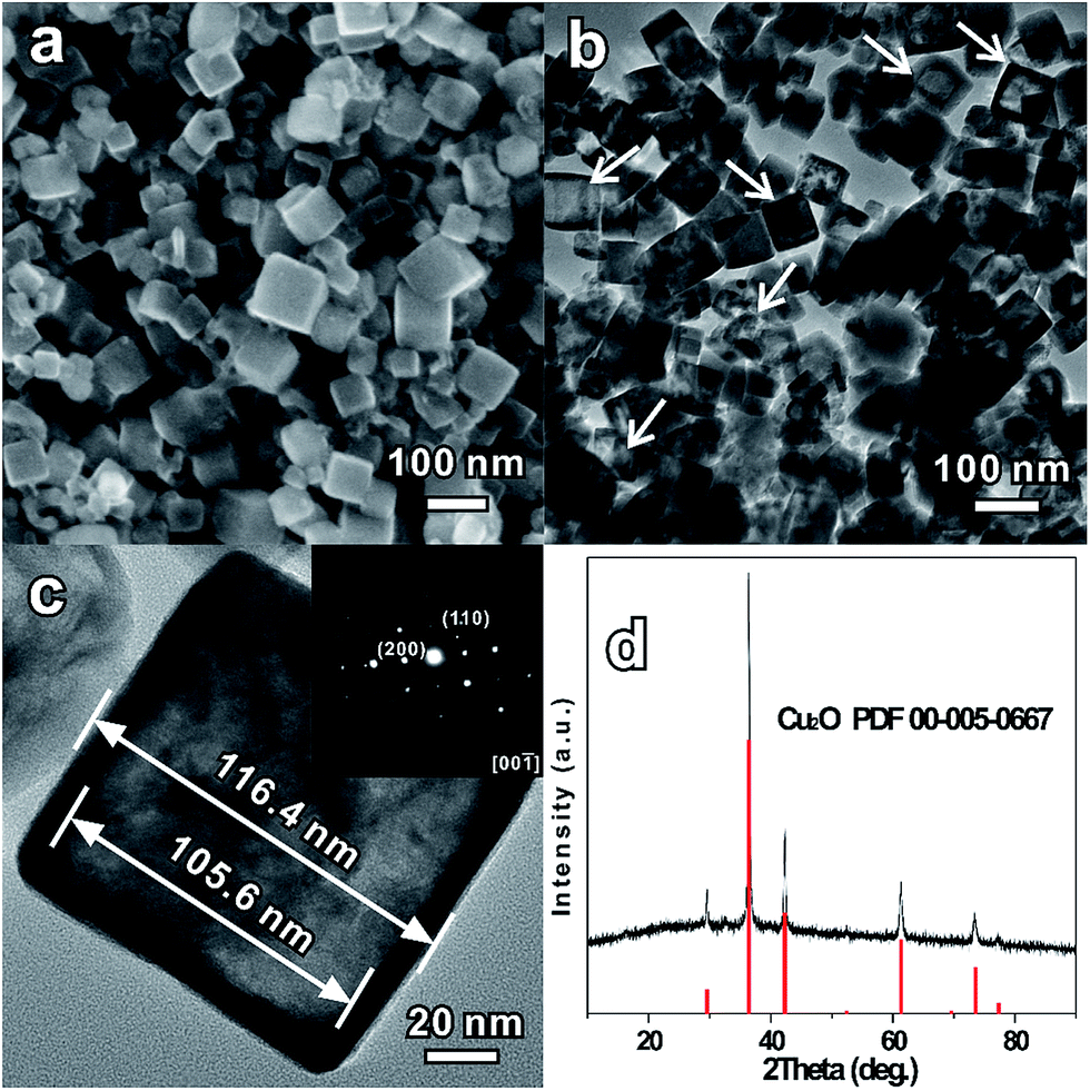 Cu2O is a p-type semiconductor and widely applied in catalysis, sensing, water splitting, photo-catalysis, etc.6,12–19 The synthesis of hollow Cu2O micro/nanoparticles has been intensely reported in past years and various formation mechanisms have been proposed and well discussed.6,20–26 In the previous reports, hollow Cu2O nanostructures were mostly formed in the presence of surfactants, which play a soft template-like role in the formation of hollow structure. By using Cu2O as example, in this paper, we try to demonstrate that single-crystalline hollow nanostructures could be likewise fabricated in the absence of foreign surfactants and hard templates. We propose that cubic CuCl, which is the reaction intermediate produced in the reaction process, plays a self-sacrificial template role in the formation of hollow Cu2O nanocubes.
