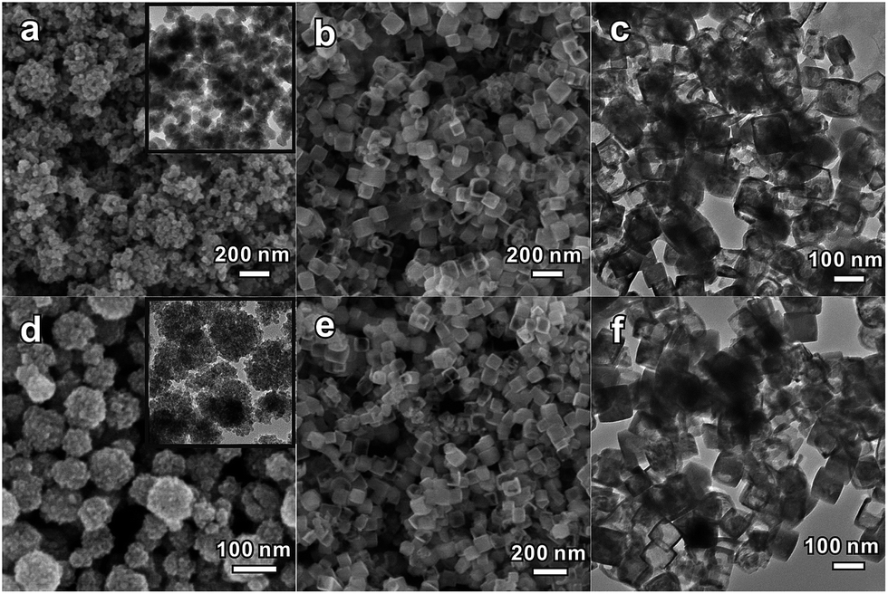 Based on the analysis above, the formation of the reaction intermediate CuCl ought to be a key procedure in the fabrication of hollow Cu2O nanocubes. Therefore, to better display the formation of CuCl and its role, CuSO4 and Cu(NO3)2, instead of CuCl2, were used as copper source in the synthetic process. In the absence of Cl− ions, only irregular balls that are composed of aggregated particles with smaller sizes are produced in both cases, as shown in Fig. 3a and d. Interestingly, hollow Cu2O nanocubes were generated in both cases when extra 3 mmol NaCl was added into the solution of copper salts. As shown in Fig. 3b and e, a large amount of broken hollow nanocubes can be observed. According to TEM images (Fig. 3c and f), the percentage of hollow nanocubes are estimated to be 85% in the two cases.