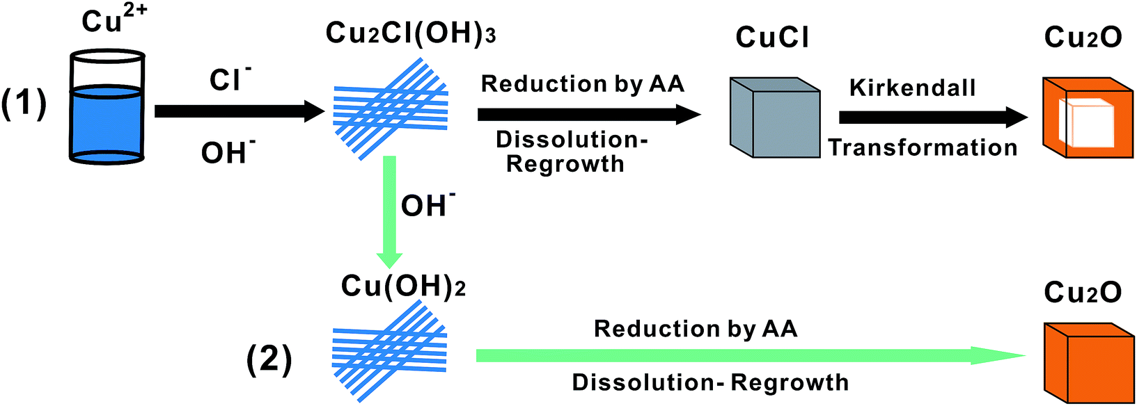 In the past, CuCl2 is often used as copper source for the preparation of Cu2O. However, the exact formation mechanism of hollow or solid Cu2O nanostructures behind the transformation from CuCl2 to Cu2O remains unclear due to the extremely fast reaction rate. On the basis of above results, we proposed that the formation of hollow Cu2O nanocubes actually experienced three procedures from CuCl2 to Cu2Cl(OH)3, then to CuCl, and finally to Cu2O. In this reaction process, the concentration of hydroxyl ions (OH−) is also a key factor, which influences the phase of initially formed colloidal precursors and determines whether the CuCl intermediates are formed in the reaction. If the concentration of NaOH is low, Cu2Cl(OH)3 is the preferred product in the reaction of CuCl2 and NaOH. When NaOH in the reaction solution is sufficient, the initially formed colloidal precursors would be Cu(OH)2, rather than Cu2Cl(OH)3, because Cu2Cl(OH)3 would quickly transform into Cu(OH)2 via a fast anion exchange.30,31