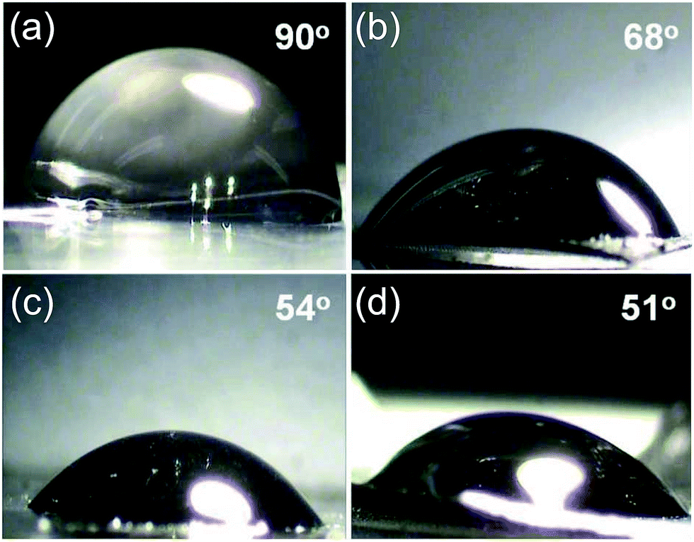 | Fig. 2 The contact angles of a 10 μl water droplet on (a) Rw 1.72 dry paper, (b) Rw 1.72, (c) Rw 0.52 and (d) Rw 0.34 hydrogel papers. | ||