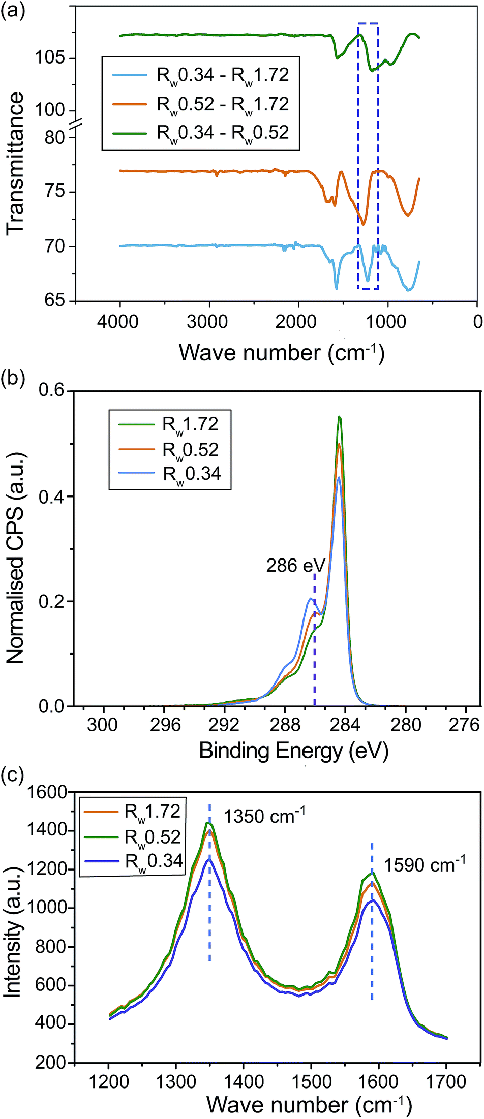 A comparison of FTIR spectra of the as-prepared hydrogel papers are depicted in Fig. 3(a). Differences in the FTIR spectra of the three types of hydrogel papers are presented in order to detect the differences in functional groups more clearly. The spectrum within the region from 1226 to 1277 cm−1 (highlighted using the dash box) corresponds to the vibrations of epoxy C–O bond.31–33 Compared with the Rw 1.72 case, the stronger spectrum intensities of the Rw 0.52 and Rw 0.34 hydrogel papers in this region indicate the existence of more C–O groups in the rGO sheets. This comparison also shows that the Rw 0.34 rGO hydrogel paper has more C–O groups than the Rw 0.52 hydrogel paper. This is as expected because more hydrazine reduction agent was used to produce the Rw 0.52 rGO sheets.