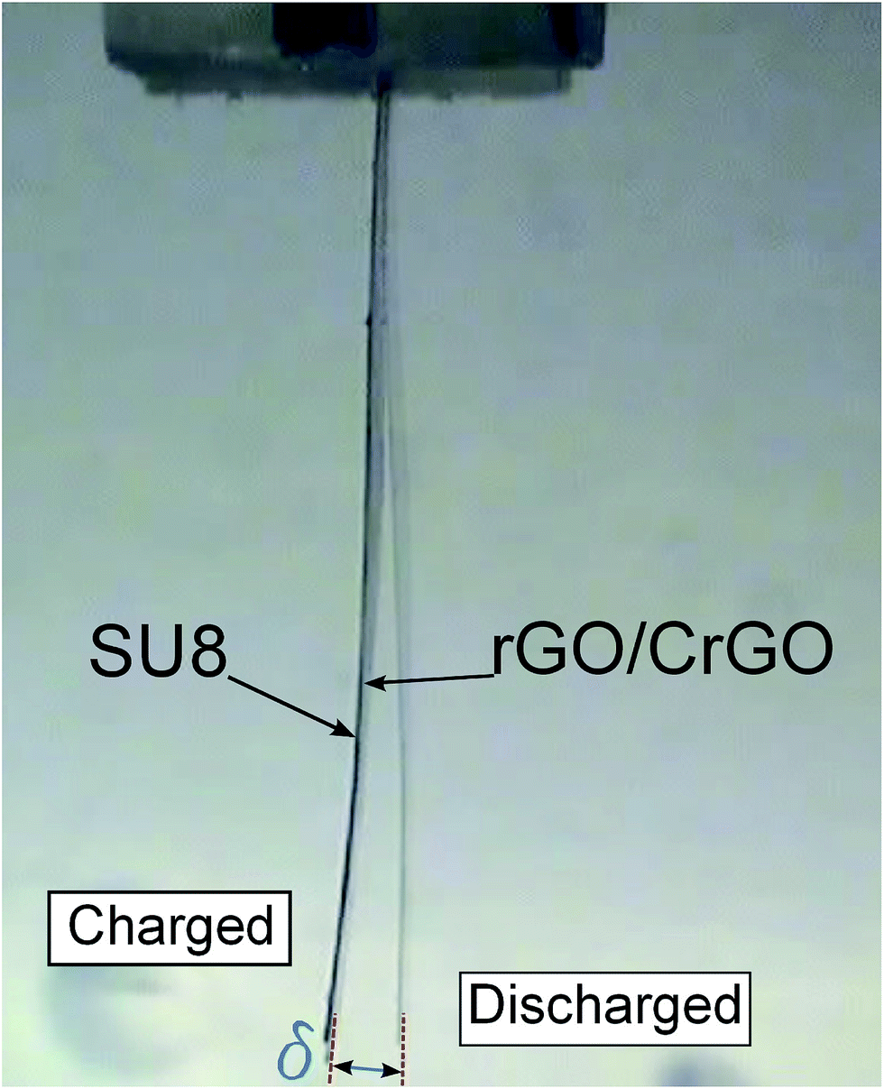 Next, to determine the electromechanical response of the graphene papers and to demonstrate their use as potential MEMS actuators, we fabricated a series of bimorph devices using SU8 as a polymer substrate as shown in Fig. 4. In the bimorph design, via tuning the thickness of rGO papers and substrates, the deflection can be enlarged to ensure an easy and accurate measurement. The surface dimensions of the device is 2 mm × 15 mm and the thickness is ∼90 μm for the dry paper devices and ∼220 μm for hydrogel paper devices. The bimorph device was mounted on a holder and immersed in 1 M NaCl aqueous solution. It was connected to an electrochemical station (Bio Logic VMP 300) as the working electrode using a platinum sheet and wires, meanwhile a platinum mesh and a saturated calomel electrode were used as the counter and reference electrodes, respectively. The chronoamperometry technique was employed to apply the square wave voltage starting from ±0.1 V up to ±1 V at increments of 0.1 V. Three charge/discharge cycles (with a period of 100 s) were conducted at a given voltage value. It should be noted that in this study the actuation characterisation was conducted at a low charging frequency of 0.01 Hz, providing sufficient time to achieve saturated actuation strain of the individual papers. Therefore, the electrical conductivity of rGO layers, which influences the actuation at high frequency, should play a minor role in our case. The deflection of the bimorph cantilevers were captured using a CCD camera (Watec; WAT-231S) mounted to a C-mount microscope (Infinity; InfiniVar CFM-2/S). The tip displacement of the bimorph cantilevers were measured using image processing techniques on the captured footage. For each type of rGO papers, the actuation experiments were repeated for 10 times using three to five bimorph devices.