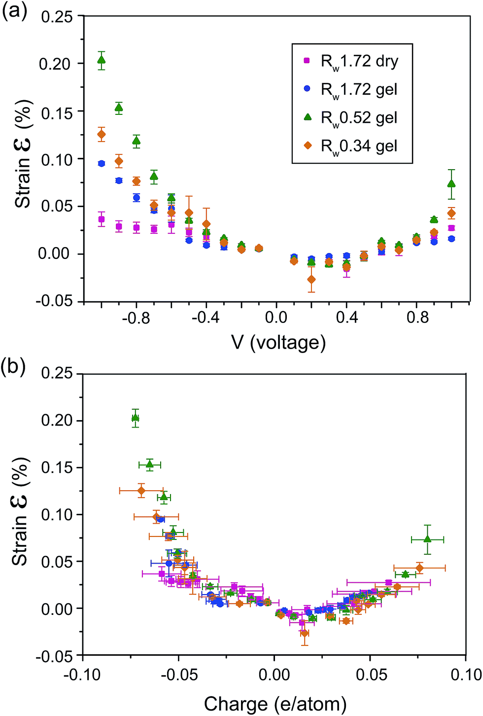 Previous studies have shown that the amount of injected charges dominate the electromechanical strain arising from the EDL effect.18,41 Hence, we integrated the measured current with respect to time to estimate the charges stored in the papers. Fig. 5(b) illustrates the strain against the respective charge per atom. At a given voltage, the Rw 1.72 dry papers store much less charge than the hydrogel papers do. This can be attributed to the much less accessible surfaces in the dry papers. The more charge accumulation in hydrogel papers enhance the coulomb forces in the EDL, generating a large driving force for mechanical deformation. At −1 V, the Rw 0.52 and Rw 0.34 hydrogel papers store similar charges: −0.072 vs. −0.069 electrons per atom. In spite of a small ∼4.3% difference in the charge values, there is a considerable ∼54% difference in the actuation strain results. This evidence indicates that the amount of injected charges (per atom) is not the only factor that governs the electromechanical actuation of our rGO papers.