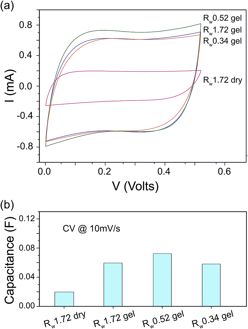 To examine the obtained relation eqn (5), we measured the capacitance and the stiffness of our rGO papers. Fig. 6(a) shows the current vs. voltage results of the rGO papers from the CV analysis. The calculated device capacitance are shown in Fig. 6(b). The hydrogel papers always have a higher electrochemical capacitance than the dry paper. This explains why the rGO dry paper bimorph device accumulated less charges at −1 V than those hydrogel papers (Fig. 5). Interestingly the Rw 0.52 rGO hydrogel paper has a slightly higher capacitance than both the Rw 1.72 and the Rw 0.34 hydrogel papers.