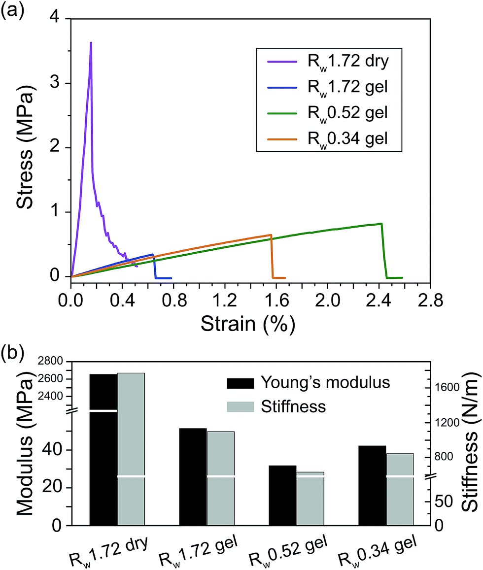 Fig. 7 depicts the obtained stress vs. strain relations in the tensile test and summarises the Young's modulus and stiffness results that were fitted using the tensile experimental data in Fig. 7(a) with strain values below 0.2%. The Rw 1.72 dry paper has the highest Young's modulus and stiffness, i.e., 2654 MPa and 1770 N m−1. Overall the hydrogel papers have a comparable Young's modulus and stiffness, in which the Rw 1.72 hydrogel paper has the highest values of modulus and stiffness and the Rw 0.52 rGO paper has the lowest ones. The low stiffness implies the lack of hindrance against the in-plane structural deformation, which should benefit the electro-chemical actuation strain output.