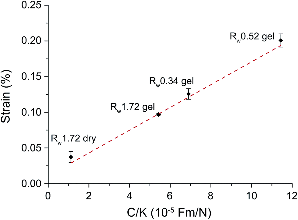 With the obtained capacitance C and stiffness K results, we plot the calculated electromechanical strain results at −1 V (Fig. 5) against the C/K values in Fig. 8. The results of the all four materials exhibit a very good linear relation, which is consistent with the derived relation eqn (5). Hence, we can conclude that indeed EDL is the dominant actuation mechanism for rGO papers and the capacitance and stiffness are two key parameters in determining the electromechanical actuation performance.
