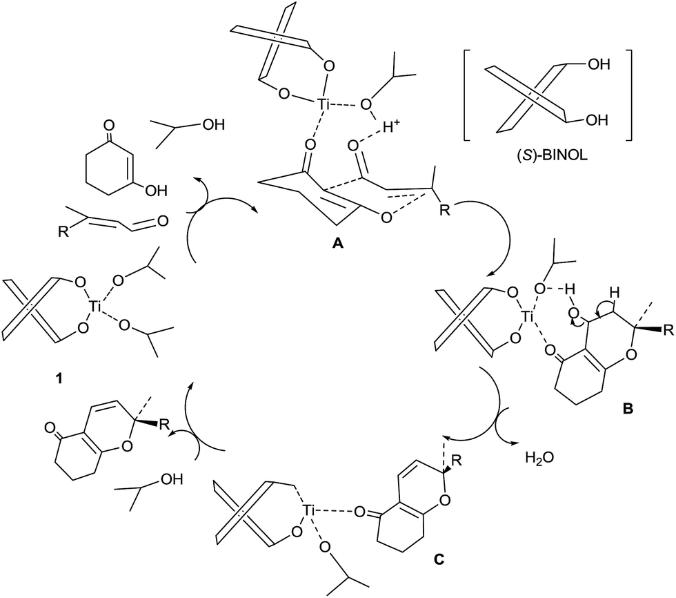 Thus, the synthesis of bicyclic tetrahydro-2H-chromen-5(6H)-one and tricyclic octahydro-2H-benzo[c]-chromen-1(6H)-one derivatives with enantioselectivity up to ee 99% has been achieved in the presence of titanium-isopropoxy-(S)-BINOLate under a solvent free condition. The stereochemistry of tricyclic product 10 has been further supported by single crystal X-ray analysis. The methodology reported herein can be used for the synthesis of various natural and non-natural molecules with chromenone moiety. This one-pot powerful strategy combines both the economic and environmental aspects of organic chemistry which are necessary for academic and industrial applications.