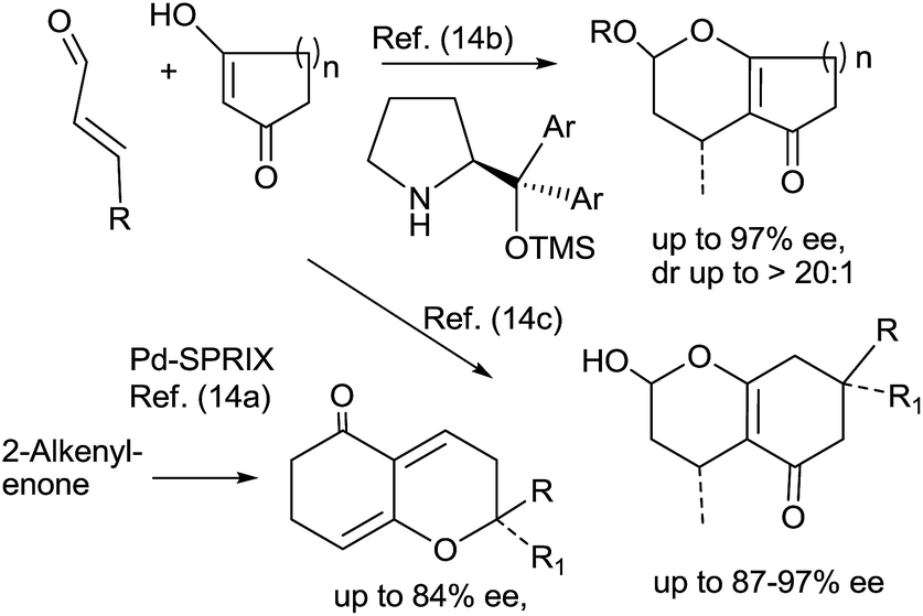 In previous reports, enantioselective cyclization of 2-alkenyl-1,3-diones promoted by Pd-SPRIX catalyst was evaluated, where isomeric 2,2-dialkyl-6,7-dihydro-2H-chromen-5(3H)-ones were formed in ee up to 88%.14a Similarly, the enantioselective addition of conjugated aldehyde to 1,3-cyclohexadione and cyclopentadione in the presence of organo-catalyst (trimethylsilyl-1,1-diaryl-prolinol) has been achieved, which yielded 4-substituted-2-hydroxy or 2-acyloxy-chromenones14b,c in ee up to 97% (Scheme 1).
