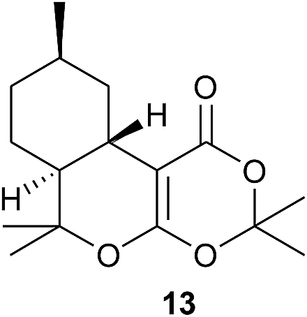 (6aS,9R,10aS)-6a,7,8,9,10,10a-Hexahydro-3,3,6,6,9-pentamethyl-[1,3]dioxino[4,5-c]isochromen-1(6H)-one (13). Yellow oil. [α]D = −40.2° (c = 1, MeOH), chiral GC analysis 33.77 min (major), 32.76 min (minor), (ee% 83); IR (CHCl3, cm−1): 2925, 2855, 1736, 1726, 1620, 1455, 1390, 1280, 1155, 994, 965, 891, 731; 1H-NMR (CDCl3, 400 MHz, TMS): δ (PPM) 2.65 (dd, J = 5.6, 18.4 Hz, 1H), 2.08–2.01 (m, 1H), 1.85–0.95 (m, 6H), 1.68 (s, 3H), 1.60 (s, 3H), 1.41 (s, 3H), 1.26 (s, 3H), 0.91 (d, J = 6.5 Hz, 3H), 0.78–0.62 (m, 1H) 13C-NMR (100 MHz, TMS): δ (PPM) 171.4, 167.3, 124.4, 85.9, 47.4, 42.3, 37.2, 36.3, 32.0, 31.8, 28.7, 27.6, 25.9, 23.5, 22.3. GCMS (m/z): 280,; HRMS (EI+) calcd for C16H24O4 280.1704 found m/z 280.1703.