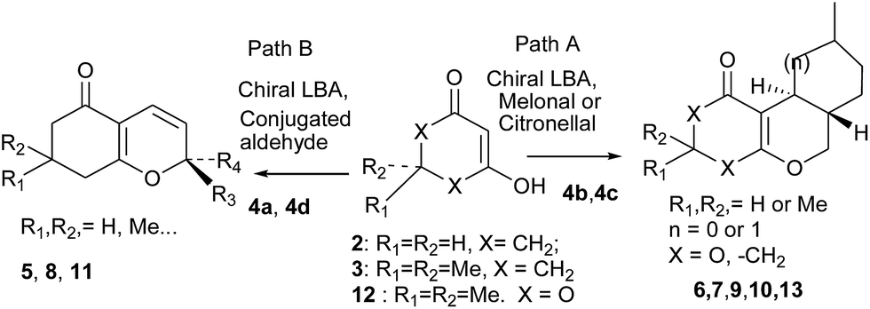 Thus, the synthesis of bicyclic tetrahydro-2H-chromen-5(6H)-one and tricyclic octahydro-2H-benzo[c]-chromen-1(6H)-one derivatives with enantioselectivity up to 98.8% has been achieved in the presence of chiral LBA, under a solvent free condition (Scheme 2, Table 1).