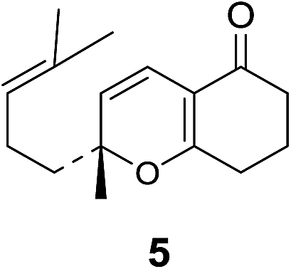 (R)-2-Methyl-2-(4-methylpent-3-enyl)-7,8-dihydro-2H-chromen-5(6H)-one (5). Yellow oil; [α]D = −65.2° (c = 1 in MeOH), chiral GC analysis: 33.79 (major), 33.19 (minor) min, ee 99%; IR (CHCl3, cm−1): 2939, 1647, 1603, 1428, 1381, 1333, 1285, 1257, 1184, 1111, 1081, 967, 864, 787; 1H-NMR (CDCl3, 400 MHz, TMS): δ (PPM) 6.45 (d, J = 10.12 Hz, 1H), 5.18 (d, J = 10.12 Hz, 1H), 5.09–5.07 (m, 1H), 2.42–2.39 (m, 4H), 2.01–1.94 (m, 4H), 1.74–1.71 (m, 1H), 1.68 (s, 3H), 1.59 (s, 3H),1.68–1.53 (m, 1H), 1.36 (s, 3H); 13C-NMR (150 MHz, TMS): δ (PPM) 194.9, 172.1, 131.9, 123.6, 121.6, 116.4, 110.3, 82.4, 41.7, 36.4, 28.6, 27.4, 25.7, 22.5, 20.6, 17.6; GC-MS (m/z): 246, 231, 213, 203, 190, 175, 163, 155, 147, 135, 122, 107, 99, 91, 77, 69, 55, 41; HRMS (EI+) calcd for C16H22O2 246.1620, found m/z 246.1622.