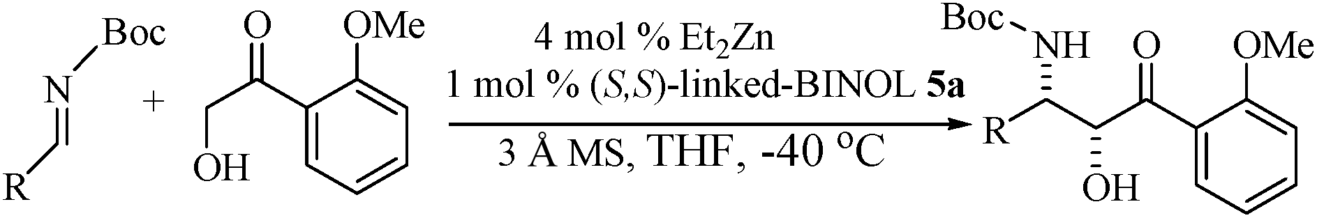 Shibasaki's dinuclear Zn–BINOL system, 5a (Fig. 2) also catalyzed asymmetric Mannich reaction; but the diastereoselectivity was found to be opposite to that observed for Aldol reaction.63 Due to the synchronized formation of two adjacent stereocenters, asymmetric Mannich reaction of α-alkoxy enolates has great importance in organic synthesis. Mannich reaction of 2-hydroxy-2′-methoxyacetophenone with N-diphenylphosphenoyl (Dpp) imines exclusively gave the anti-alcohols with comparable yield and enantiomeric excess (Table 2). In the optimized reaction condition (1 mol% of ligand, 4 mol% of Et2Zn and 3 Å MS were used in THF at −20 °C), imines derived from α-nonenolizable aldehydes and aromatic ketones with ortho-substituent resulted exclusively the anti-adduct with high ee. The imines derived from α,β-unsaturated aldehydes gave adducts with low dr.