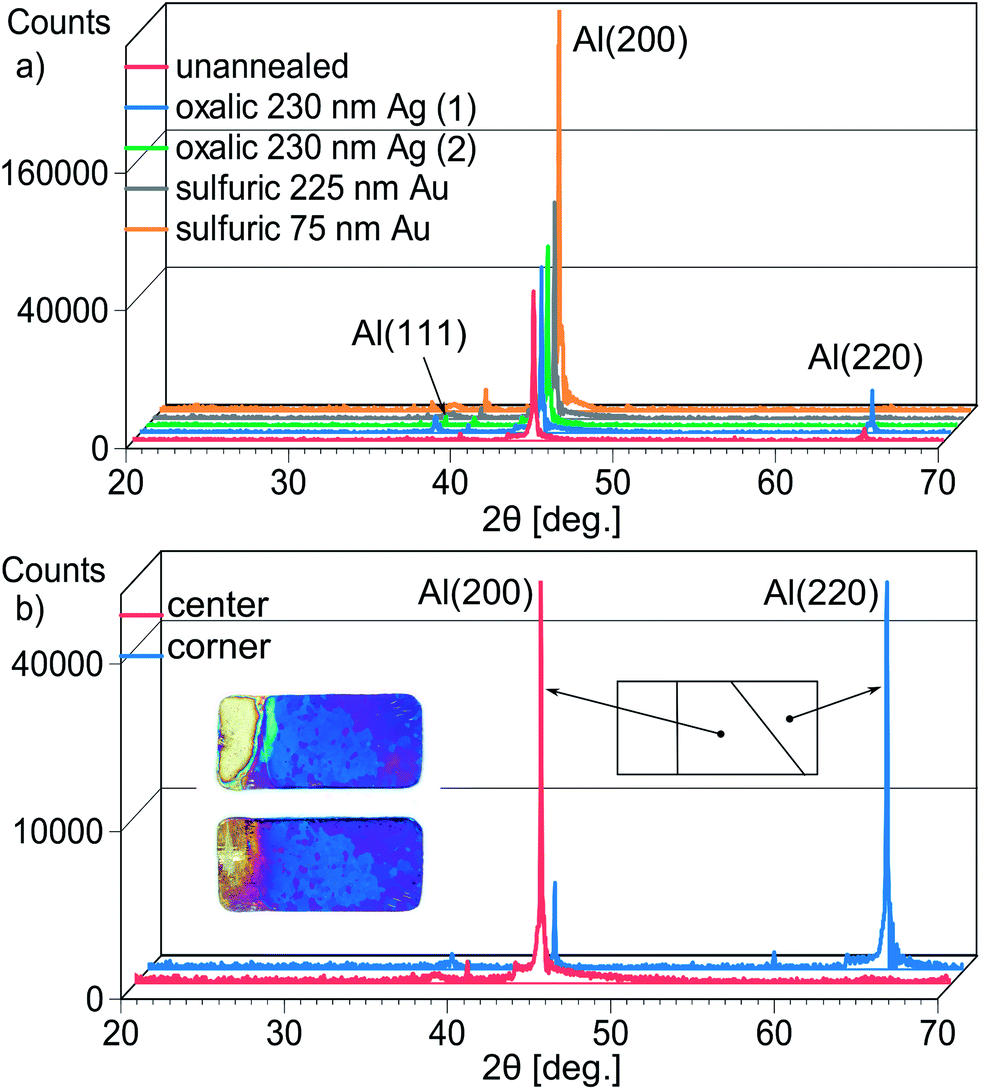 In order to determine which type of grains correspond to different AAO layer thicknesses, the samples were analyzed using XRD. The dominant crystallographic orientation for the majority of samples is (100) (Fig. 10a). An odd sample with a significant area of an inverted grain pattern was cut into pieces, and these areas were analyzed separately (Fig. 10b). It becomes evident that grains with thinner AAO layers have the (110) orientation. Similar results were obtained for thick AAO membranes exceeding 100 μm.50 The preferred orientations arise during annealing,51 however, we note that (220) grains occur near the sample edges and are likely seeded by mechanical stress when the Al sheets are cut prior to thermal treatment.