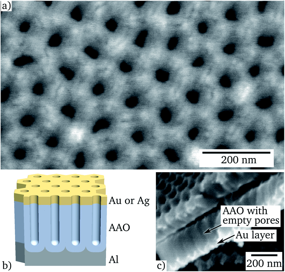 In the case of a large AAO layer thickness to pore diameter aspect ratio, i.e., deep and narrow pores, the sputtered metal does not fill the pore volume, nor does it accumulate as nanoparticles at the bottom of the pores, but rather, it forms a film with holes on top of the membrane (Fig. 1b). The hole formation and emptiness of the AAO pores is confirmed by SEM measurements (Fig. 1c), however, the shape of holes is not perfectly cylindrical. The step coverage at the pore entrance results in a smaller concentration of voids in the metal layer. There is also a considerable roughness in the metal film due to the topography of the AAO surface.32 This may cause some diffuse reflections and the broadening of spectral features.