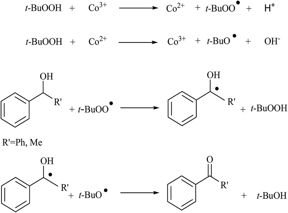 In a continuation of previous work, Baskaran et al. studied alcohol oxidation using silicate intercalated CoAl-hydrotalcite (CoAl-HTSi) materials.187 The as-synthesized materials showed a layer structure, which is converted into a spinel matrix with uniform distribution on intercalated silica upon calcinations. The nature of the cobalt was analyzed using X-ray photoelectron spectroscopy (XPS). XPS showed two major peaks with satellite peaks, the major peaks corresponding to Co 2p3/2 and Co 2p1/2 with binding energy 782 and 797 eV respectively. From the XPS studies it was determined that Co was present in the mixed oxidation state (Co3+ and Co2+) with uniform distribution of Co3+ on CoAl-HTSi. The developed materials were tested for benzhydrol oxidation using TBHP in decane as the co-oxidant with the formation of benzophenone as the major product of 100%. The authors also monitored the reaction in the presence of radical scavenger BHT (butylated hydroxyl toluene) and found that there was a reduction in conversion. From the above result it was evident that the mechanism proceeded through a radical mechanism (Scheme 13). The catalyst also extended to various aliphatic and aromatic alcohols and the results are reproduced in Table 10.187 The presence of more exposed cobalt active species on CoAl-HTSi materials was responsible for the better catalytic activity.