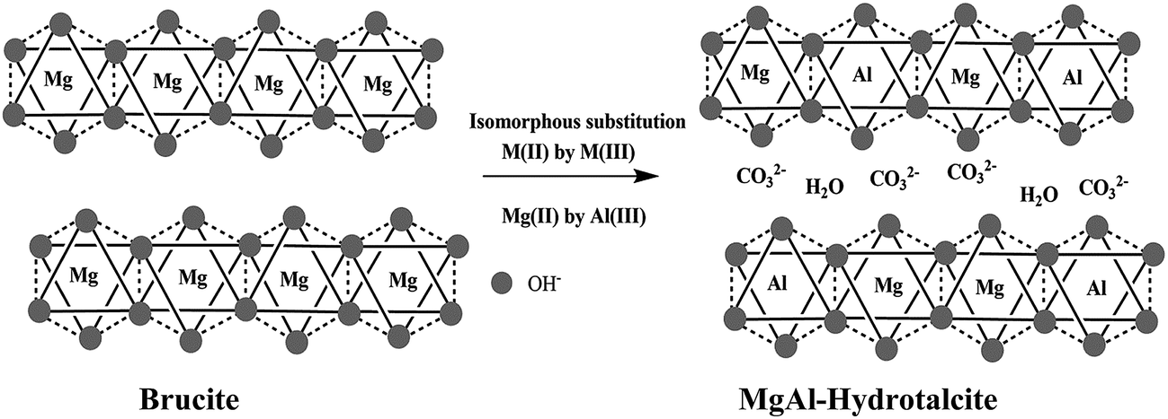 The general molecular formula of HT-like materials is represented by [M(II)(1−x)M(III)x(OH)2]x+[Ax/nn−]mH2O, where M(II) is divalent (Mg, Ni, Co, Zn) and M(III) is trivalent (Al, Cr, Fe, In) metal cations, x represents the fraction of the M(III) cation, namely x = M(III)/(M(III) + M(II)), and An− denotes anions. The anions present in the interlayer are exchangeable, giving rise to elegant intercalation chemistry.2,5–7 The sheets containing both di- and trivalent cations occupy randomly the octahedral holes of the close-packed configuration of hydroxyl ions and the interlayer constituents; that is, the anion and water are randomly located in this region and possess a high degree of mobility.