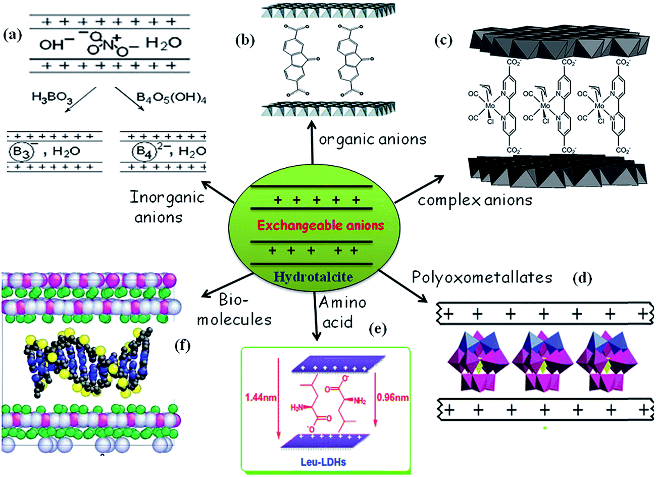 | Scheme 3 Pictorial representation of various anions intercalated in hydrotalcite materials for various applications ((a) adapted from ref. 44 with kind permission from Elsevier; (b and c) reprinted from ref. 119 and 75 with permission from the Royal Society of Chemistry; (d and e) adapted from ref. 120 and 121 with kind permission from Elsevier; (f) reprinted with permission from ref. 122. Copyright (2008) American Chemical Society). | ||