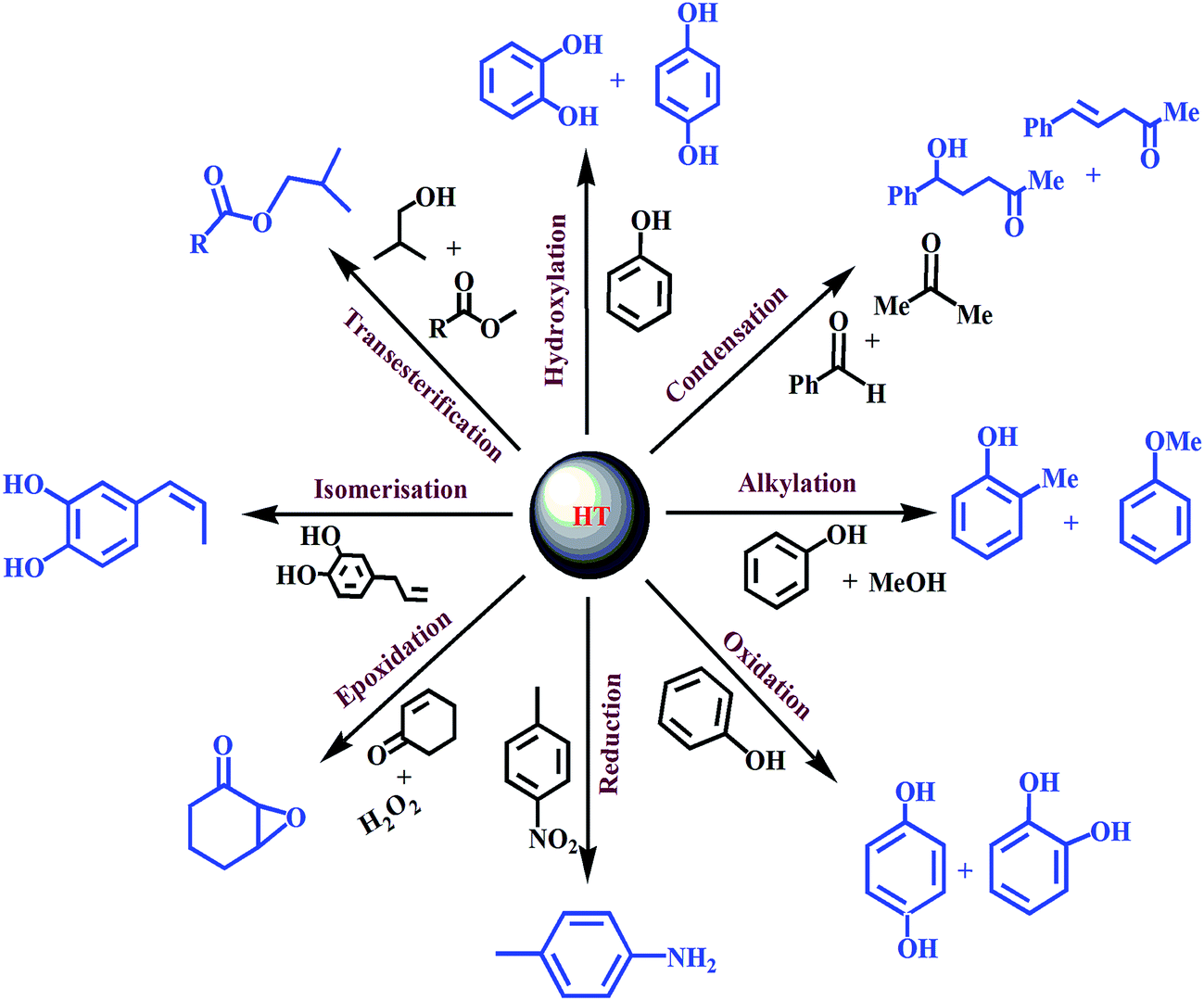 The present review is restricted to the recent development of HT as a catalyst for organic transformations and application of HT as adsorbents. The ability to synthesize a variety of tailor-made layer materials and their tunable intrinsic properties make these materials promising as catalysts or a catalytic support in many organic transformations (Scheme 4), such as alkylation, isomerization, hydroxylation, transesterification, hydroformylation, redox reactions, condensation and environmentally friendly reactions.