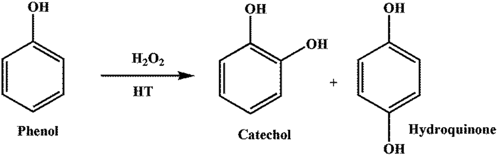 Phenol to catechol and hydroquinone is an important industrial process (Scheme 5) and these products are used in various fields. Antonyraj et al. studied phenol hydroxylation using various hydrotalcite (HT) materials (as-synthesized and calcined) with H2O2 as oxidant.143 Among the various HT materials (CuZnAl-HT, CuMgAl-HT, CuNiAl-HT and CuCoAl-HT), CuZnAl-HT was observed to give the best phenol conversion in both as-prepared and calcined form (21.6 and 17.6% respectively) and the results are reproduced in Table 7.143 The authors explained that the better activity is based on the presence of Cu2+ in the octahedral sites of HT materials.
