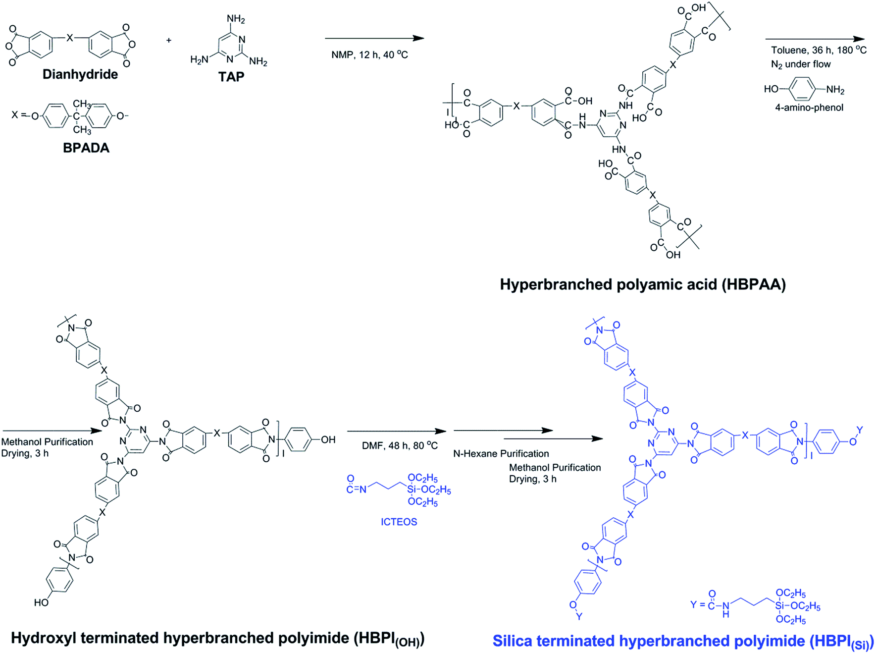 Modifying the end-groups of the hyperbranched polyimides is an effective way to improve their phase dispersion composition because by adding flexible organosilane terminal groups the polymers become highly soluble and reactive.