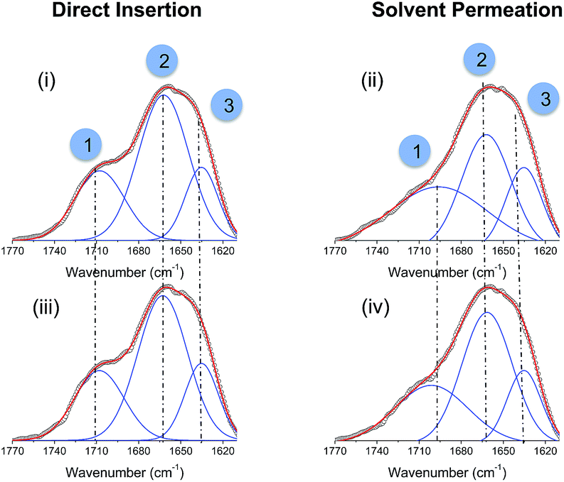 O stretches located within disordered hydrogen-bonded POE-urea associations of increasing strength, and a third component at 1635 cm−1 (Peak 3) due to self-organised, hydrogen-bonded urea–urea interactions.26,27,42 The absence of a peak at 1750 cm−1 further confirms that all urea groups undergo hydrogen-bonding interactions.26,27 A slightly decreased contribution from Peak 3 is observed for DI-PBS-4.0 when compared to DI-HTMA-4.0, suggesting the formation of a less ordered host network upon incorporation of the anionic PBS-PFP. The SP-samples also exhibit a three-component amide I band; however their relative contributions differ considerably. A decrease in Peak 1 is accompanied by a concomitant increase in the relative contribution of Peak 2 (10%). This suggests that the incorporation of CPE via Solvent Permeation disrupts and reorders the disordered hydrogen-bonded POE/urea associations, which is consistent with swelling and contraction of the di-ureasil network. We note that the hydrogen-bonded urea–urea interactions (Peak 3) appear to be unaffected by this process.