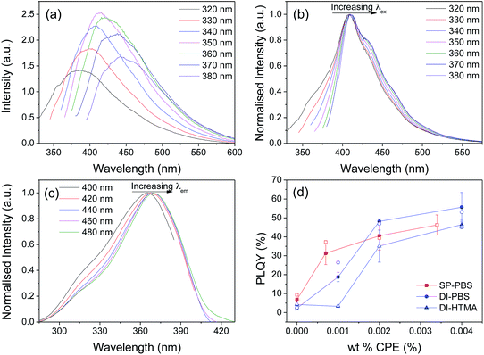 The corresponding photoluminescence quantum yields (λex = 370) as a function of wt% of CPE incorporated are shown in Fig. 5d.53 Undoped di-ureasils prepared by both methods exhibit a PLQY of 2.3–6.8%, which is in good agreement with previously reported values for di-ureasils synthesised via hydrochloric acid catalysis.27 Remarkably, a dramatic increase in PLQY as a function of increasing CPE wt% is observed, reaching 56% and 47% for DI-PBS-4.0 and DI-HTMA-4.0, respectively. A significant increase in PLQY is also observed for the SP-PBS series, reaching 31% for SP-PBS-0.7. This increase in the photoluminescence yield cannot arise simply from the summed contribution of the individual components. In the solvent systems used to prepare the CPE-di-ureasils, PBS-PFP (25% (v/v) 1,4-dioxane/water) and HTMA-PFP (25% (v/v) MeCN/water) exhibit a maximum PLQY of 23.5% and 28.7%, respectively. Similarly, pure thin films of these CPEs typically display low PL quantum yields (PLQY ∼ 7.5% for HTMA-PFP54). If these values are simply combined with the typical PLQY for di-ureasils (4–10%),43 the obtained quantum yield would be substantially lower than the values determined here. An alternative pathway must operate in CPE-di-ureasils to yield this dramatic photoluminescence enhancement.