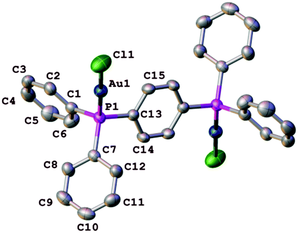 The first systematic high pressure study into the relationship between aurophilicity and luminescent properties of Au(I) complexes appeared in 2014 with a series of four trimeric pyrazolate-based complexes.15 The observed red shifts of their luminescence on increasing pressure were correlated with changes in aurophilicity in these systems. In contrast, the lack of emission in complexes incorporating the sterically-demanding diphenylpyrazolato ligand was attributed to the absence of intermolecular aurophilic interactions under pressure, precluded by the bulk of the ligand. There is a general scarcity of high pressure studies of coordination complexes,16 not just of Au(I) species. As part of our focus on the chemistry of organogold complexes,17 we were interested in investigating the influence of pressure in modifying aurophilic interactions in [1,4-C6H4{PPh2(AuCl)}2] 1, a representative of a significant class of phosphine Au(I) halides which demonstrate significant luminescence.18 Properties such as emission are highly sensitive to the nature of the Au⋯Au interaction. Herein, we present the first high-pressure study for this family of Au(I) complexes, in which we employ pressure to investigate the nature of the Au⋯Au interaction in a controlled manner not possible using conventional synthetic chemical substitution approaches. As a complement to our crystallographic approach,19 Hirshfeld surface analysis, theoretical calculations and high pressure Raman spectroscopy of 1 were employed to advance our understanding of the effects of pressure on this model complex.