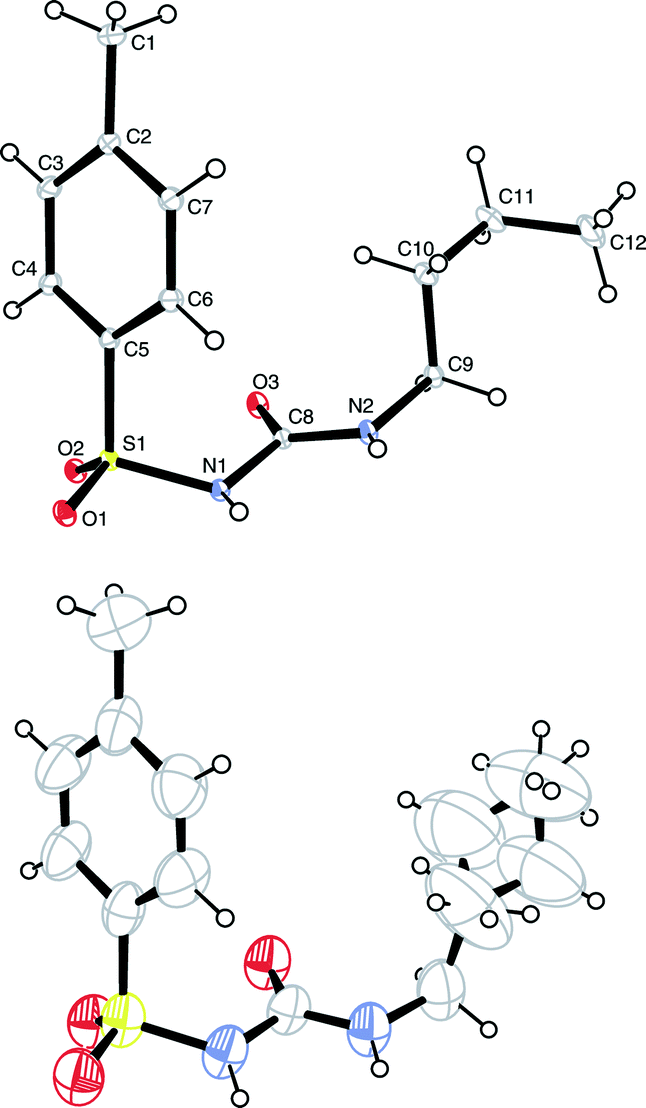 Additionally, for the tolbutamide polymorphs, II and III, the data have been collected in the temperature range from ambient to 100 K, with unit cell parameters refined with a step size of 25 K. Data for tolbutamide III at three temperature points (100, 150, and 295 K) were reported previously17 and agreed with the results in the present work. The crystal structure of tolbutamide II at 295 K was refined under the assumption that one in four molecules in the asymmetric unit had a disordered alkyl tail, and thus agreed well with that reported in,15 where it was refined at 153 K. We have also refined the crystal structure of tolbutamide II at 100 K. A model with disorder suggested the occupancy of the second orientation of the alkyl tail below 20%, without a significant improvement in the value of the R-factor. Since the second orientation was also rather close to the main one (conformer adjustment at the most), we have given preference to a model without disorder over two selected positions, but with high values of atomic displacement parameters in general, which is common for many structures with alkyl tails (see Table 1). The unit cell parameters for polymorphs I, II, and III for all temperatures are reported in Table S1 of the ESI.†