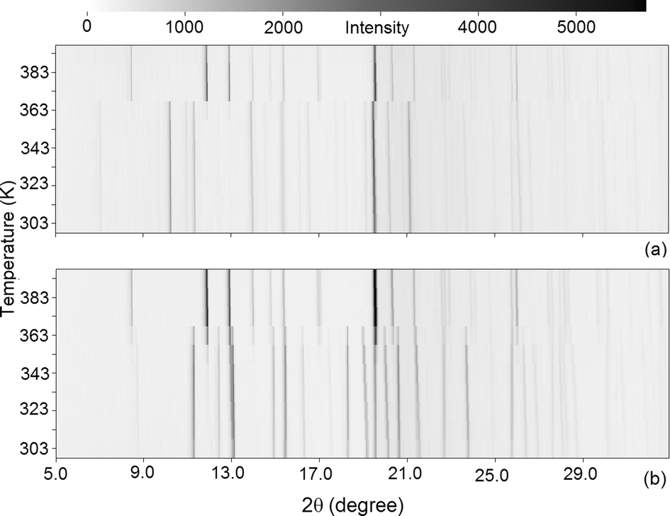 The X-ray powder diffraction patterns were recorded on a STOE STADI-MP diffractometer (CuKα1 radiation, curved Ge monochromator, transmission/Debye–Scherrer mode) with a high temperature attachment for capillaries.