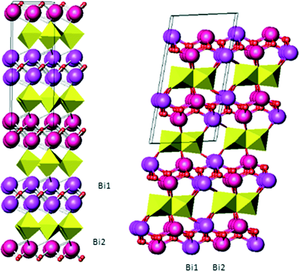 The finding that BiYWO6 can serve as an active water-splitting photocatalyst under visible light,18 making it possible to store solar energy as hydrogen fuel, sparked new interest in this material. Traditionally, this compound has been synthesized by high-temperature methods such as solid-state reaction19 and microwave-assisted solid-state reaction.20 These methods lead to low specific surface area, making the compound impractical for catalytic applications. BiYWO6 was recently reported to be synthesized also by the sol–gel and hydrothermal methods, exhibiting photocatalytic activity under visible-light irradiation.21 The facile sol–gel preparation procedure paved the way for the use of film electrodes made of Bi2−xYxWO6 as photoanodes for water oxidation. The optical and electrical properties of the resulting compounds are expected to depend on their composition, which thus affects their photocatalytic properties. Among the Bi2−xYxWO6 compounds, BiYWO6 is the only one whose crystallographic data have been reported to date.20 BiYWO6 was shown to have the same monoclinic structure as the high-temperature phase of Bi2WO6 and other bismuth tungstates containing ytterbium, neodymium and lanthanum17 such as Bi0.7Yb1.3WO6. The orthorhombic structure (Bi2WO6 at room temperature) and the monoclinic structure (Bi2WO6 at high temperature and Bi2−xMxWO6, M = Yb, Nb, La) consist of alternating layers of BiO2 and WO6 (Fig. 1) but differ with respect to the connectivity of the WO6 octahedra: in the orthorhombic structure, all the basal corners are shared by the WO6 octahedra, whereas in the monoclinic structure the octahedra tilt at 45° and share one edge and two corners forming chains of two corner-sharing octahedra parallel to the b-axis. This difference affects the Bi2O2 layer. In the orthorhombic structure, all of the Bi cations have the same chemical environment so that the two Bi crystallographic sites differ only in their symmetry. In contrast, in the monoclinic structure, the two Bi crystallographic sites have different environments, as illustrated in Fig. 1. From this figure, it is possible also to highlight that the monoclinic structure is more flexible in the Bi2O2 layer; thus, it can more easily accommodate cations with different dimensions.