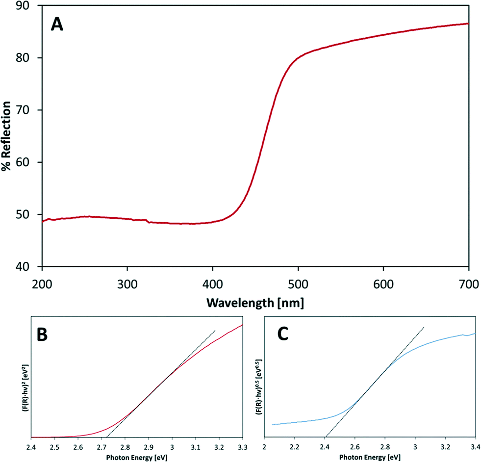 | Fig. 3 UV-vis measurement data for Bi1.7Y0.3WO6. (A) Diffuse reflectance spectrum. (B) Tauc plot assuming a direct optical transition. (C) Tauc plot assuming an indirect optical transition. | ||