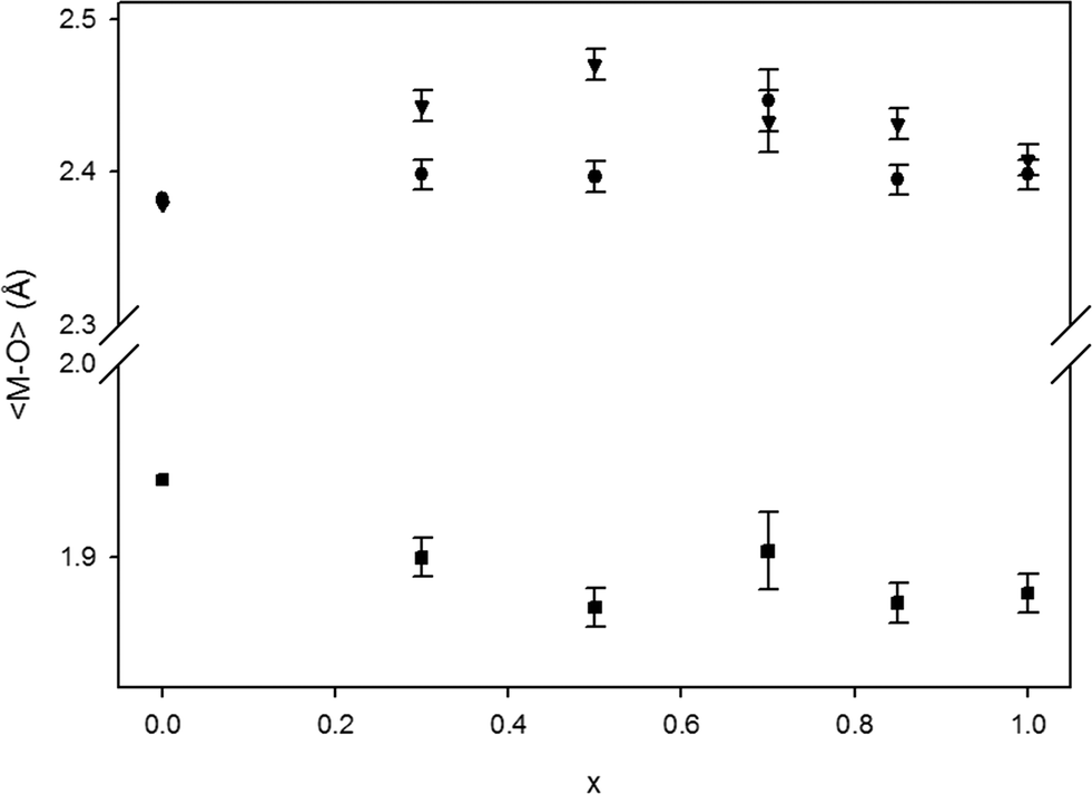 | Fig. 7 Average M–O distances. The data for x = 0 were taken from published data.27 Black dots, triangles and squares refer to Bi1–O, Bi2–O and W–O bond lengths, respectively. | ||