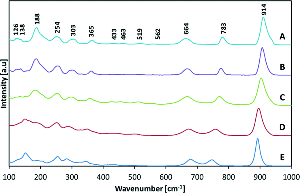 | Fig. 8 Intensity-normalized Raman spectra of BYW powders of various compositions: BiYWO6 (A), Bi1.15Y0.85WO6 (B), Bi1.3Y0.7WO6 (C), Bi1.5Y0.5WO6 (D) and Bi1.7Y0.3WO6 (E). | ||