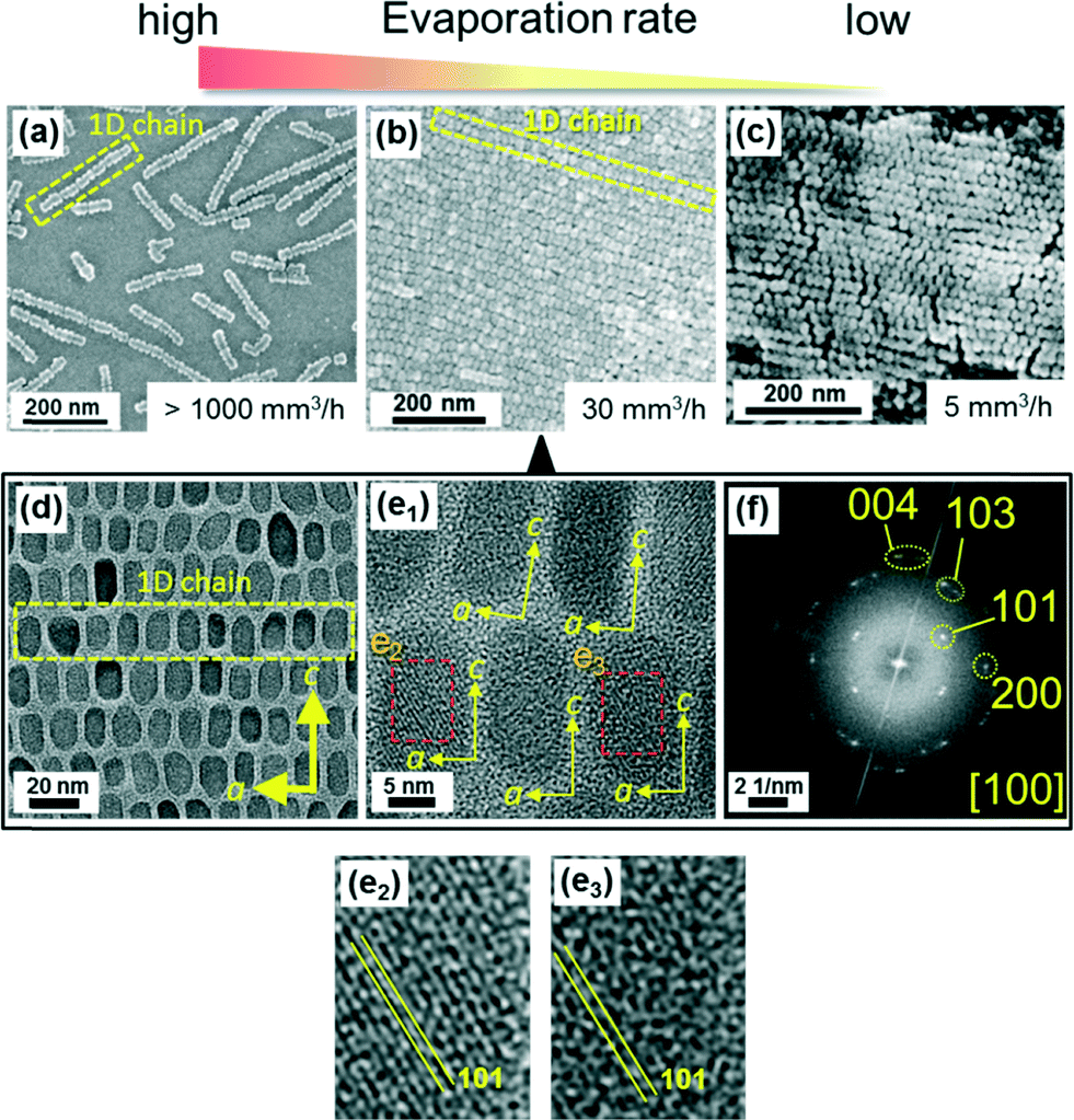 As illustrated in Fig. 4, the ordered arrays of truncated nanoblocks are fabricated on a substrate by convective self-assembly through evaporation of a liquid media from a dispersion. The nanoblocks covered with oleic acid are concentrated at the air-liquid interface due to their hydrophobicity (Fig. 4a). As the interface shrinks during evaporation, the 1D chains of the nanoblocks are formed in the a direction through the attachment of relatively large a faces by a lateral capillary force. The 1D chains are stacked in the c direction at the air–solid–liquid interface as the dispersion recedes on the substrate with evaporation (Fig. 4b). The parallel arrays are roughly ordered when the 1D chains are stacked rapidly. Tightly packed 2D rhombic superlattices are constructed with gentle assembly of the 1D chains by decreasing the evaporation rate (Fig. 4c).