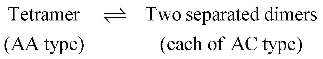 (i) Two dimers that belong to a tetramer are pulled apart in such a way that the configurations of the resulting dimers are unaltered i.e., each dimer resembles an AA dimer throughout the pulling process. Let us call the free energy associated with this step as ΔG2AA4AA.