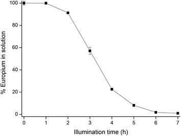 Solutions were illuminated for several hours and samples were taken at various time intervals in order to determine the rare-earth concentration in solution at different illumination times. An aliquot of the sample solution (0.5 mL) was centrifuged at 4000 rpm for 10 min in an Eppendorf tube of 1.6 mL to separate any EuSO4 precipitation from the supernatant. An aliquot of the supernatant (100 μL) was taken for analysis of the metal content.