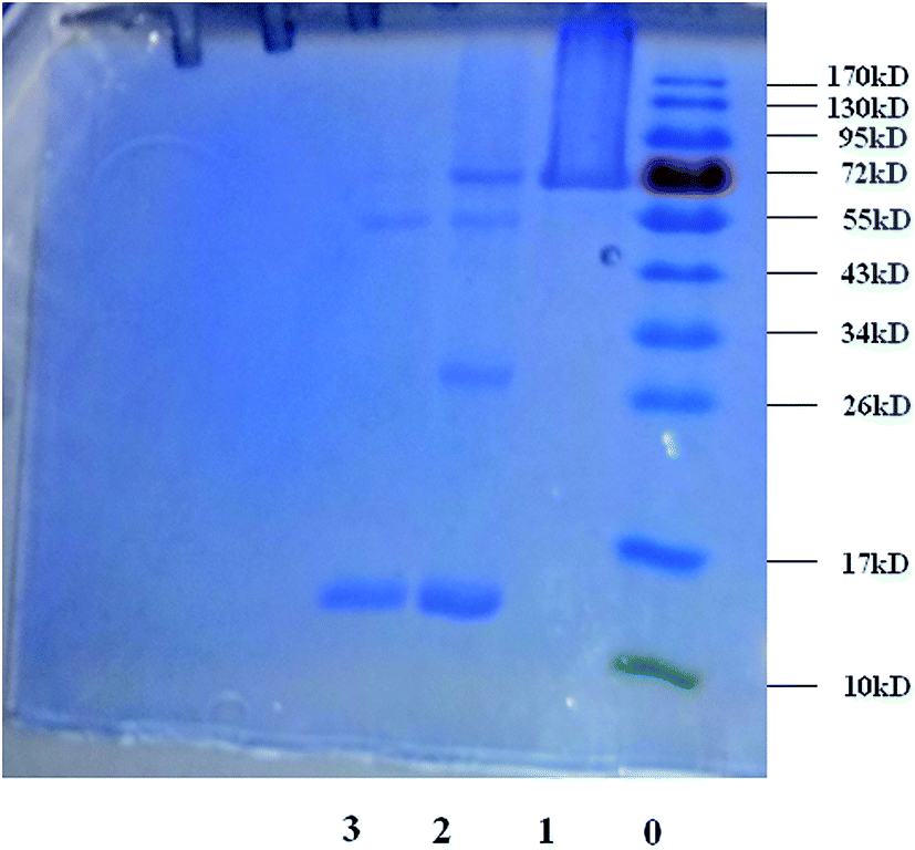 |  | Fig. 11  The results of SDS-PAGE analysis for the extraction of protein from bovine calf whole blood. Lane 0: protein molecular weight marker; lane 1: a pure BSA solution; lane 2: bovine calf whole blood diluted 100-fold; lane 3: bovine calf whole blood after treatment with Fe3O4/APTES/GO/IL4. |  |