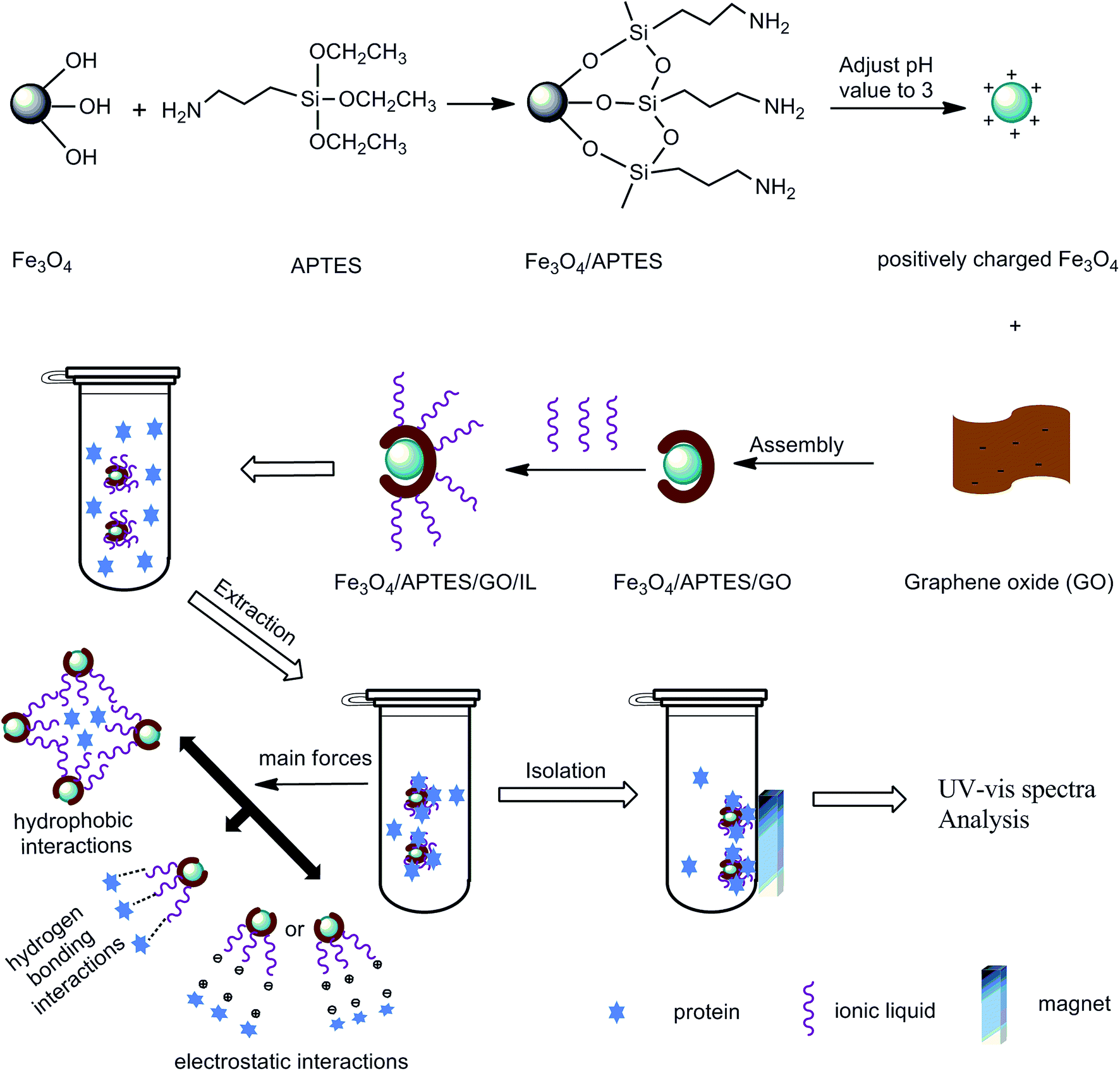 |  | Scheme 1  Synthesis of Fe3O4/APTES/GO/IL and its application for the MSPE of protein. |  |