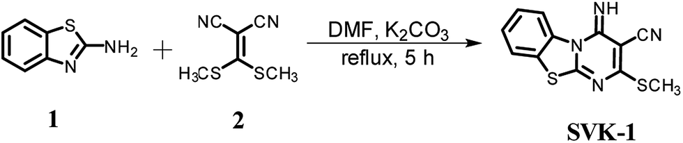 A sensitive and selective receptor 3-cyano-4-imino-2-methylthio-4H-pyrimido[2,1-b][1,3]benzothiazole (SVK-1) bearing a fused pyrimido benzothiazole structure was developed for the recognition of HSO4− anions. UV-vis and fluorescence emission spectroscopy were employed for the recognition for HSO4− over other anions such as Cl−, Br−, I−, F−, AcO−, H2PO4−, ClO4− and NO3− in an aqueous medium.