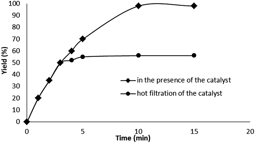 Another test was performed to check if this active catalyst, Fe3O4/GO/PW, is indeed heterogeneous (Fig. 10). After the hot filtration no further conversion was observed in the model reaction as a proof that no homogeneous catalyst was present in the reaction mixture.