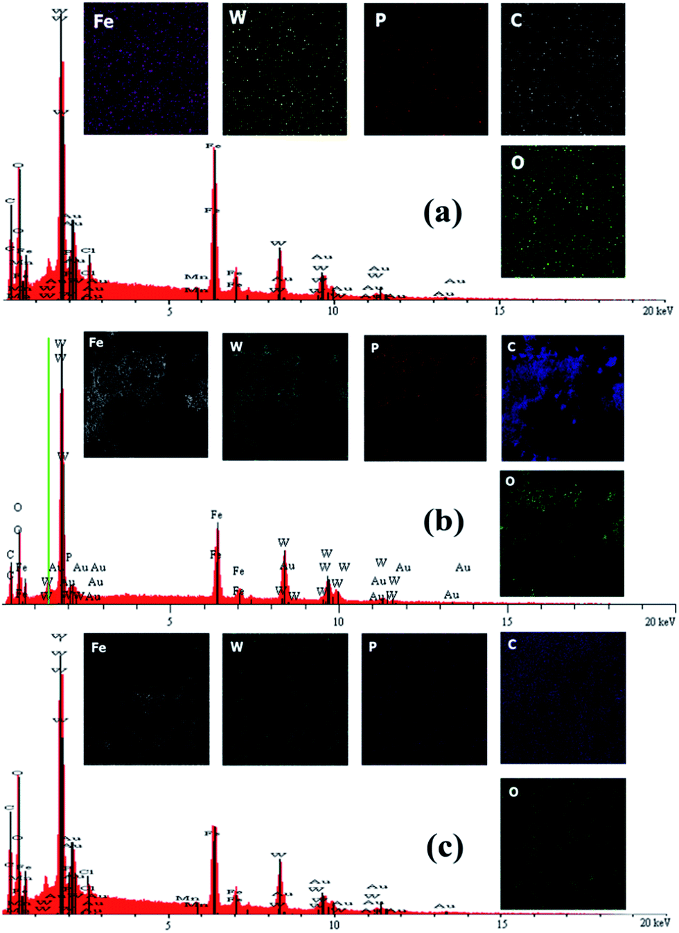 | | Fig. 1 EDX spectrum of (a) Fe3O4/GO/PW (b) Fe3O4/GA/PW and (c) PW/SMNs. | |