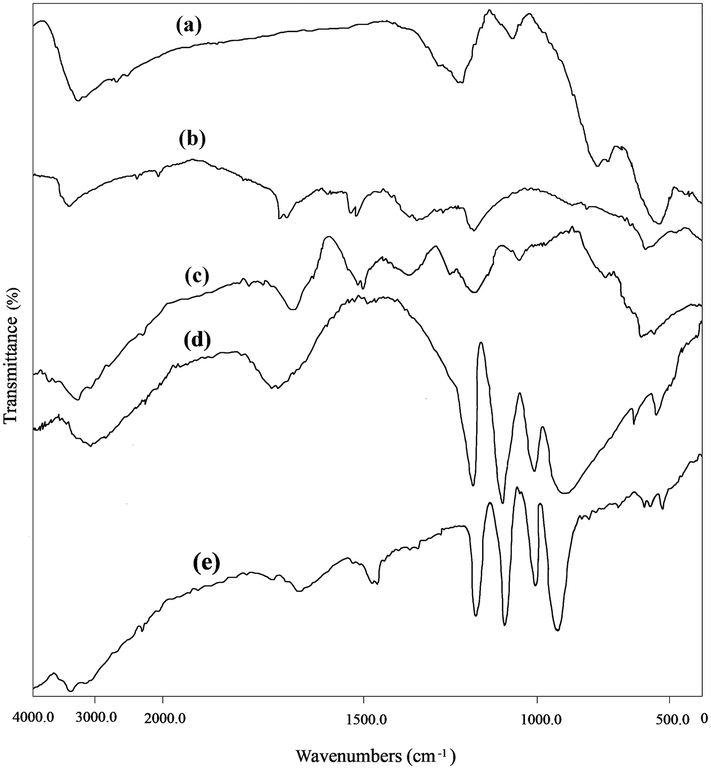 | | Fig. 2 FTIR spectra of the (a) GO (b) Fe3O4 (c) Fe3O4/GO (d) PW and (e) Fe3O4/GO/PW. | |