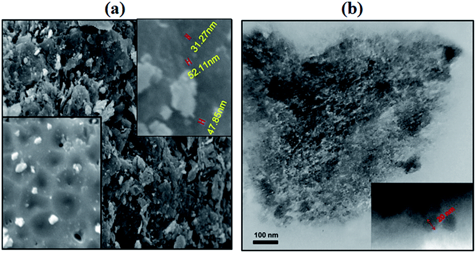 | | Fig. 3 (a) SEM and (b) TEM images of Fe3O4/GO/PW nanocatalyst. | |