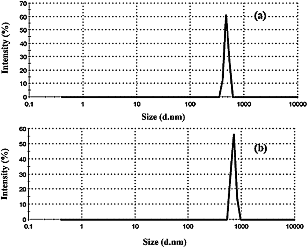 | | Fig. 4 Grain size distribution of (a) Fe3O4/GO and (b) Fe3O4/GO/PW. | |