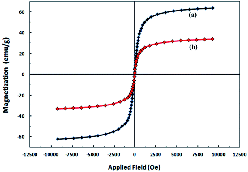 The magnetic property of Fe3O4/GO and Fe3O4/GO/PW were measured using VSM (Fig. 7). The magnetic measurement (Ms) of Fe3O4/GO and Fe3O4/GO/PW are about 60 and 30 emu g−1, respectively. There is no hysteresis, proposing that Fe3O4/GO/PW is superparamagnetic.