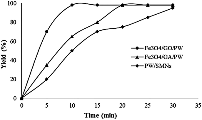 Results show that higher catalytic activity in short reaction time was found in the presence of the Fe3O4/GO/PW (Fig. 8).