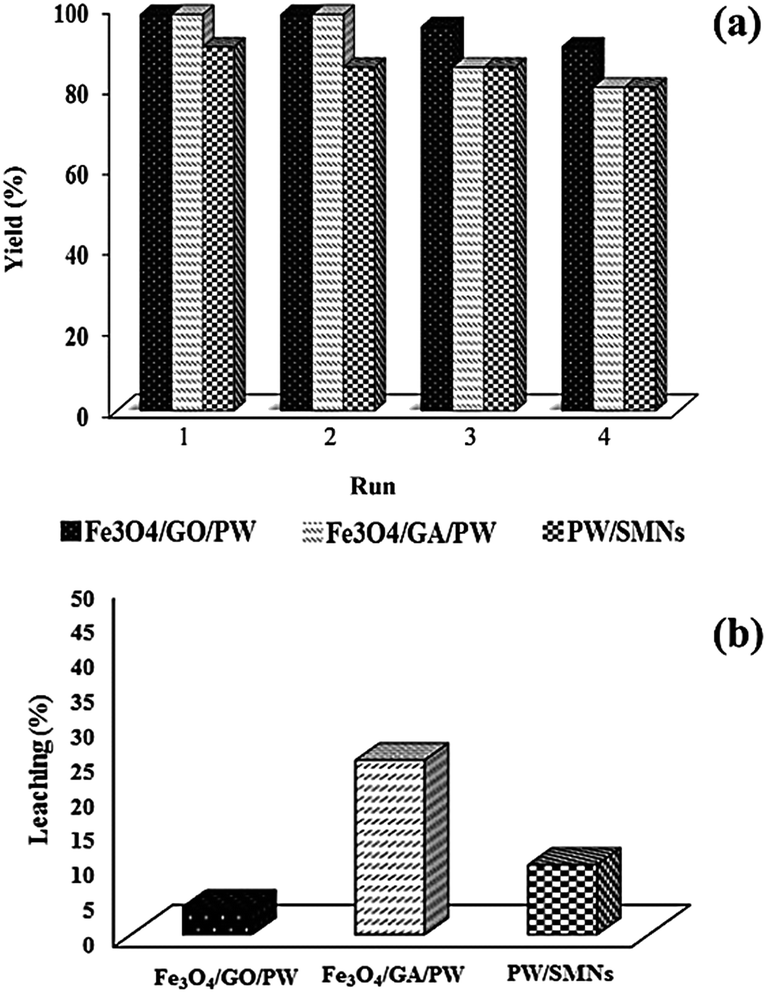 The reusability and leaching of three different magnetic catalysts were studied by employing recovered catalysts in the model reaction (Fig. 9a and b). For Fe3O4/GO/PW, the interacting species were well dispersed on the support surface and leaching was low during the reaction which confirmed by ICP-AES measurement as well. So, the Fe3O4/GO/PW catalyst could be recovered and reused several times; only 4.9% of the initial PW content totally leached into the reaction mixture during four successive runs. The yield of the product was not substantially changed (10% difference) after the fourth run. Fe3O4/GA/PW and PW/SMNs could be reused at least four times, albeit with slightly decrease in activities compared to Fe3O4/GO/PW. This behavior may indicate that some leaching of the active species should occur during the subsequent reaction cycles which confirmed by the ICP-AES measurement. As a result, it seems that 11.6% and 26.2% of the PW were leached out from the Fe3O4/GA/PW and PW/SMNs surface during four runs (Fig. 9b).